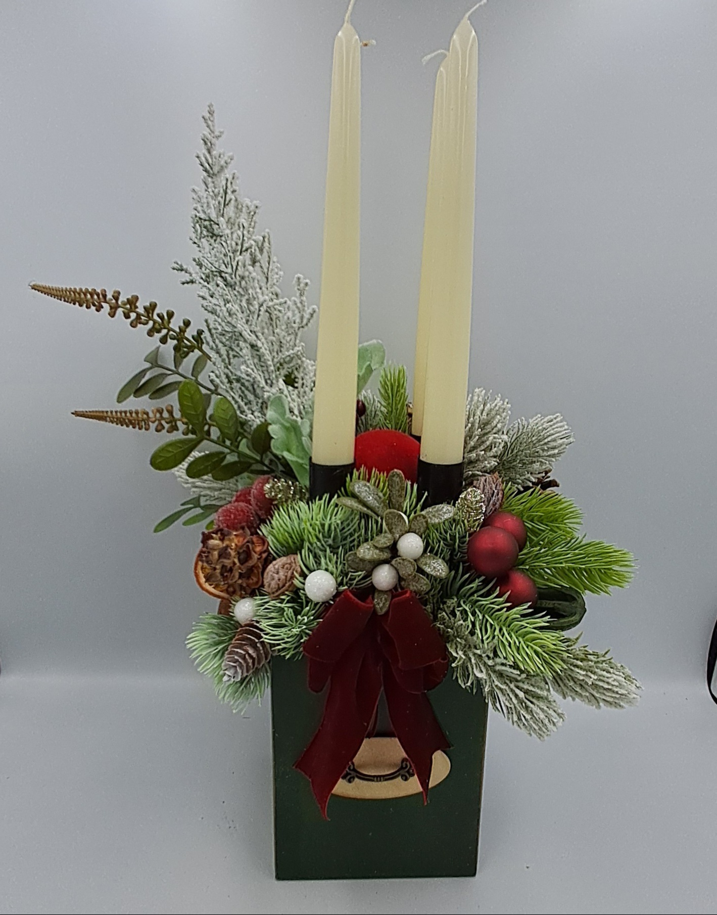 A Fenyő Erdő Szíve kézzel festett fa dobozba készült ünnepi dísz, élethű havas fenyőágakkal, bordó bársonyszalaggal és prémium jeges bogyókkal. A magas gyertyák letisztult, klasszikus adventi hangulatot teremtenek. Látványos darab előszobai konzolra, komódra vagy ajándéknak.