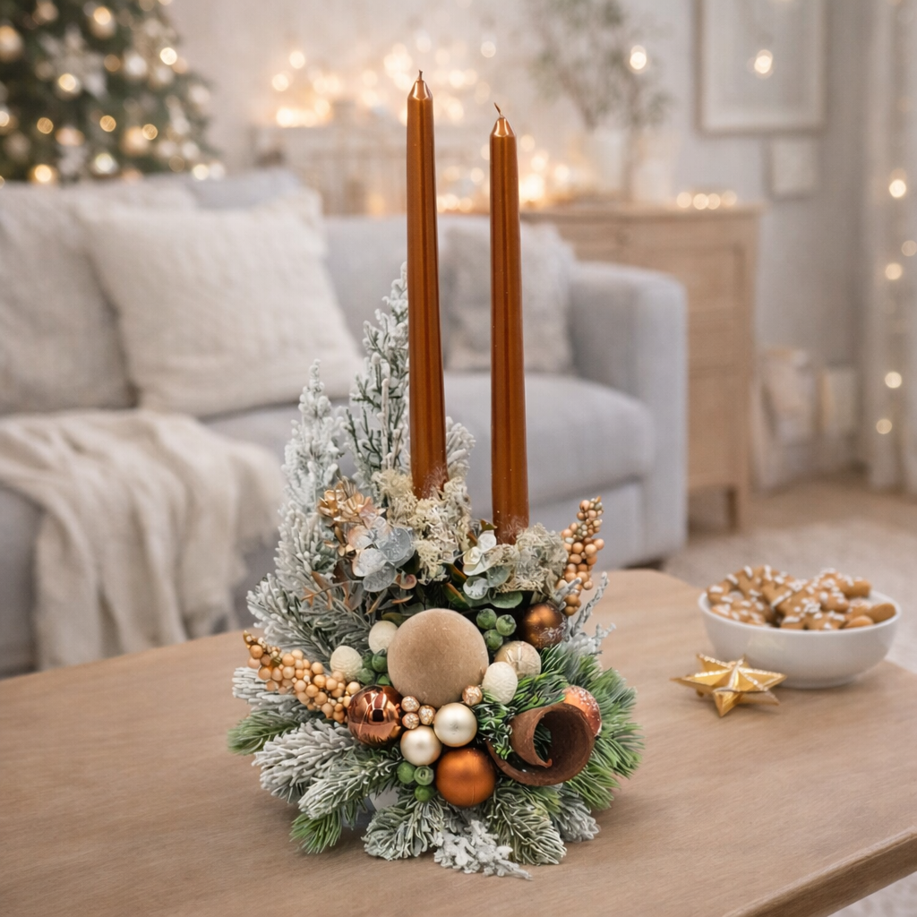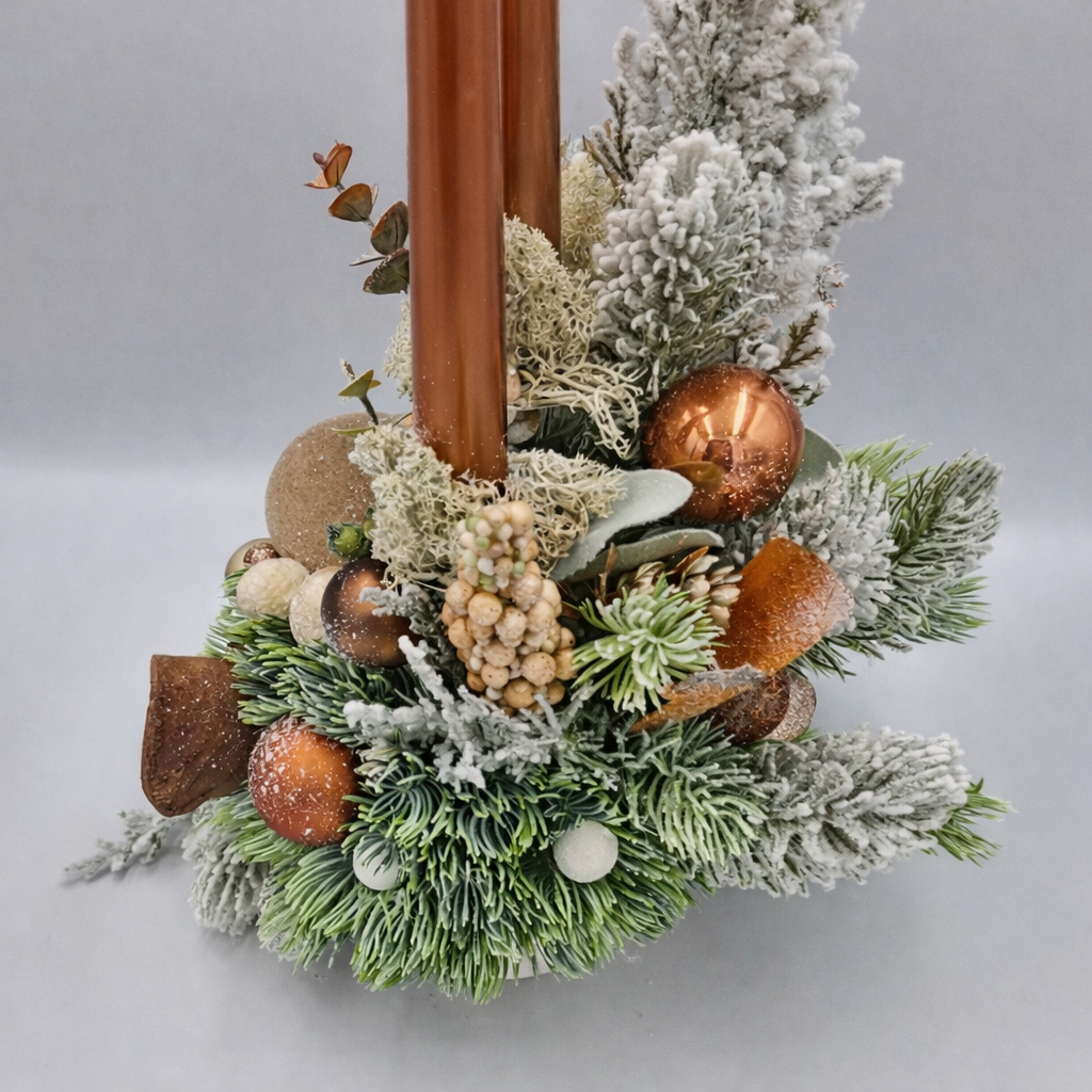 A dísz középpontjában két karcsú, bronz színű gyertya áll, amelyek meghitt, ünnepi hangulatot teremtenek.