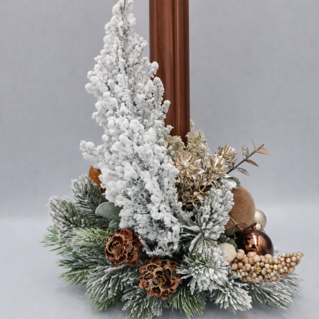A kompozíciót élethű, havas műfenyő ágak, finoman válogatott prémium díszítőelemek és meleg tónusú bronzos–krém színek teszik különlegessé.