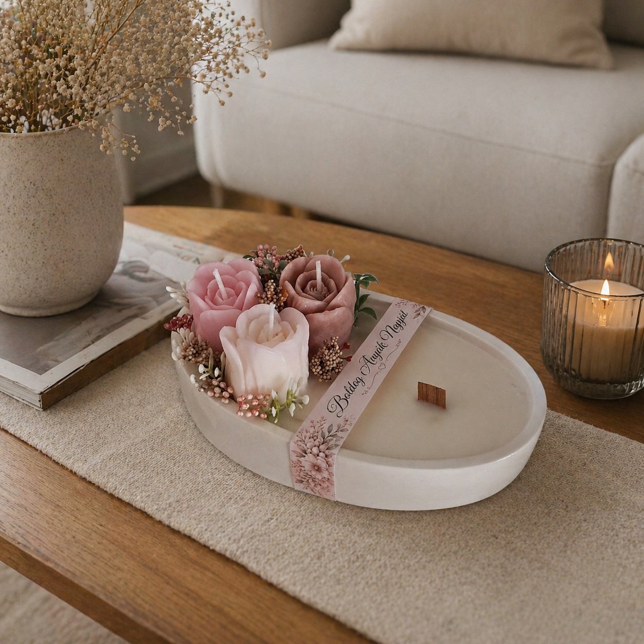 A kézzel öntött kerámia tál elegáns, letisztult formája harmonikusan egészíti ki a benne elhelyezett, szintén kézzel öntött szójaviasz gyertyákat. A virág formájú gyertyák és az aprólékos díszítés egyedi, romantikus hangulatot teremtenek.