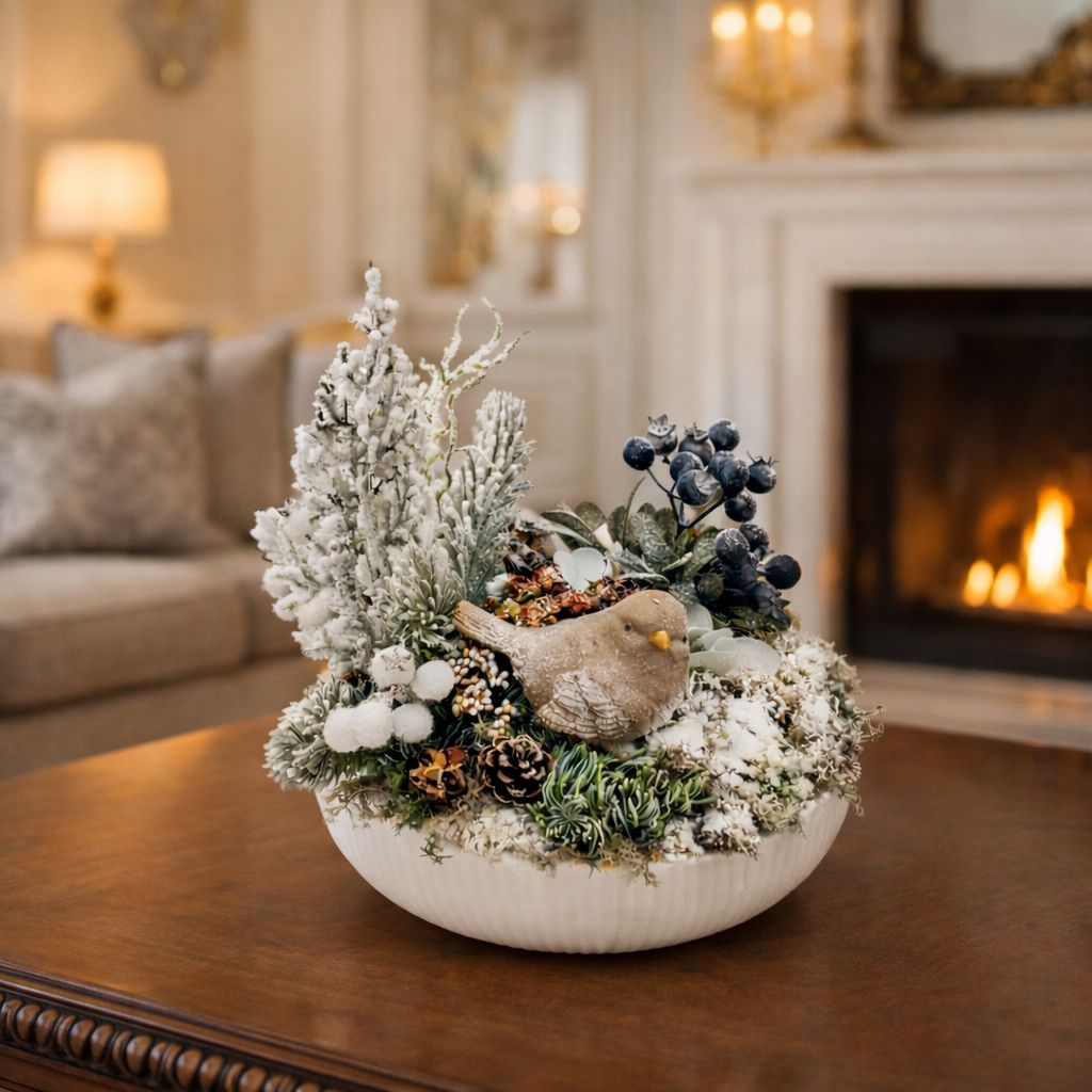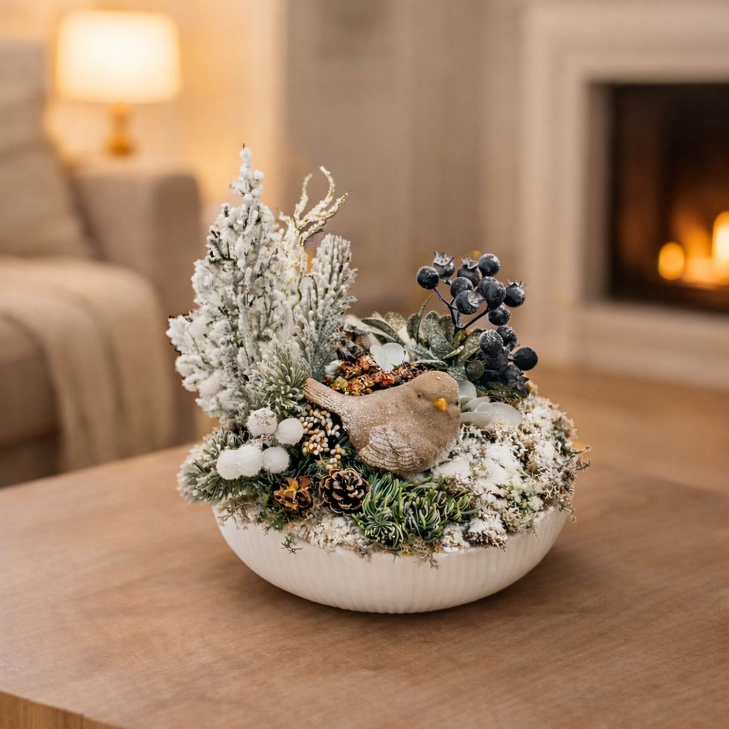 A kompozíció alapja egy 20 cm átmérőjű, kézi öntésű kerámia tál, amelyben élethű, finoman havas hatású növények, termések és egy részletgazdag kerámia madárka kapott helyet.