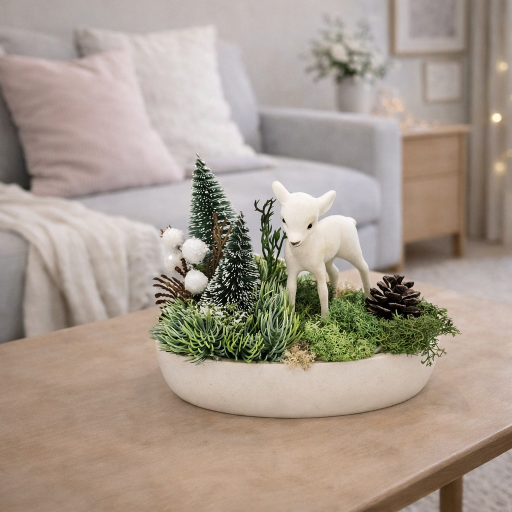 A kompozíció középpontjában egy finom megjelenésű őzike áll, körülötte élethű fenyők, természetes hatású növények, moha és tobozok alkotnak harmonikus egységet.
