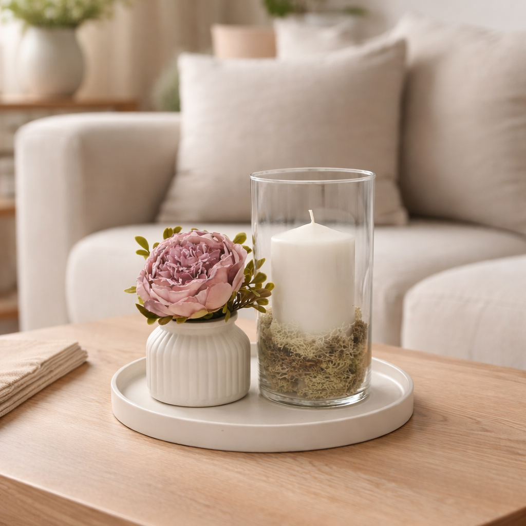 A fehér tónusú kerámia tálon elhelyezett gyertya és az üveghenger finom fényjátéka harmonikus egységet alkot a púder árnyalatú virágdísszel.
